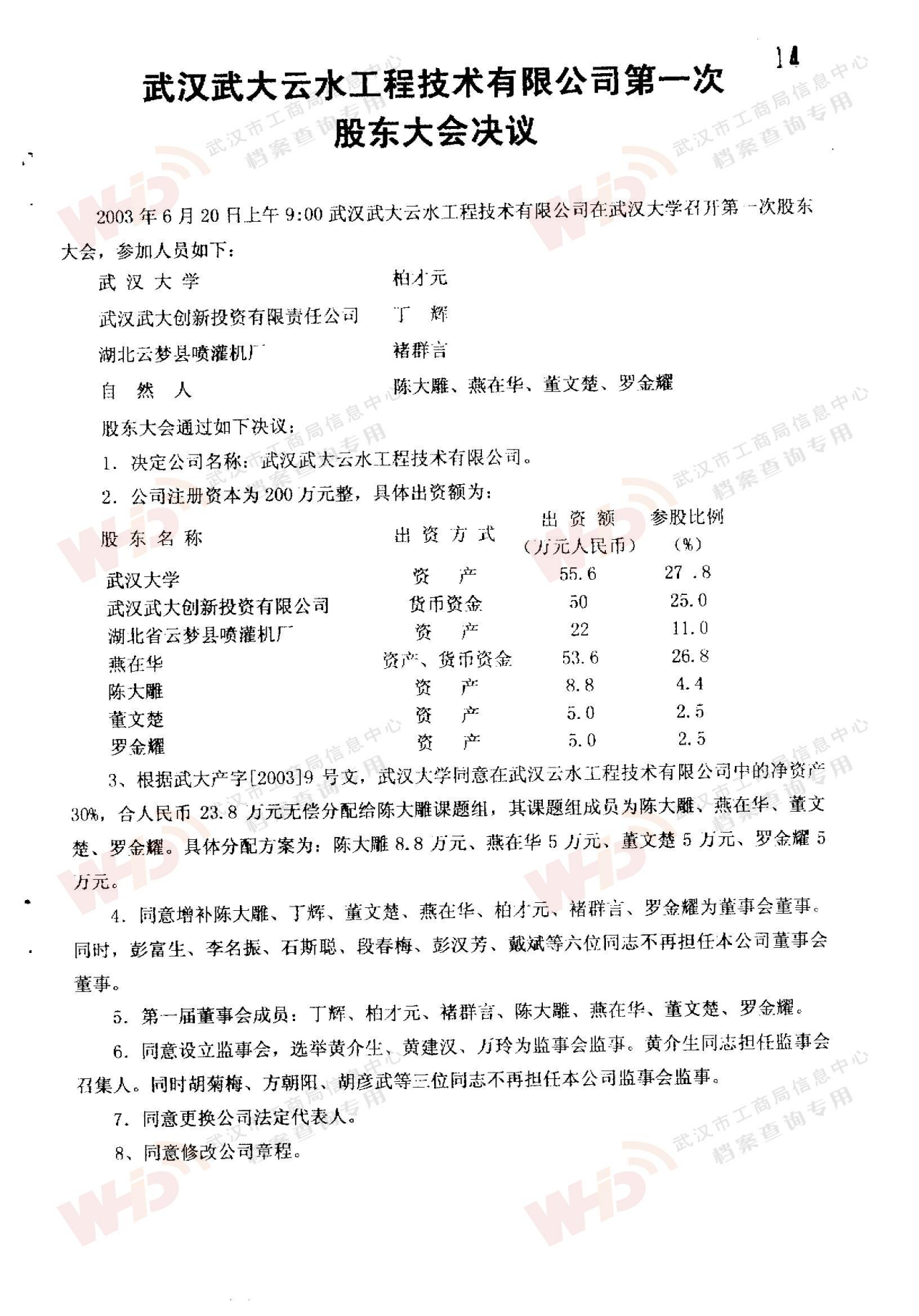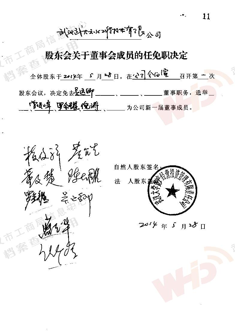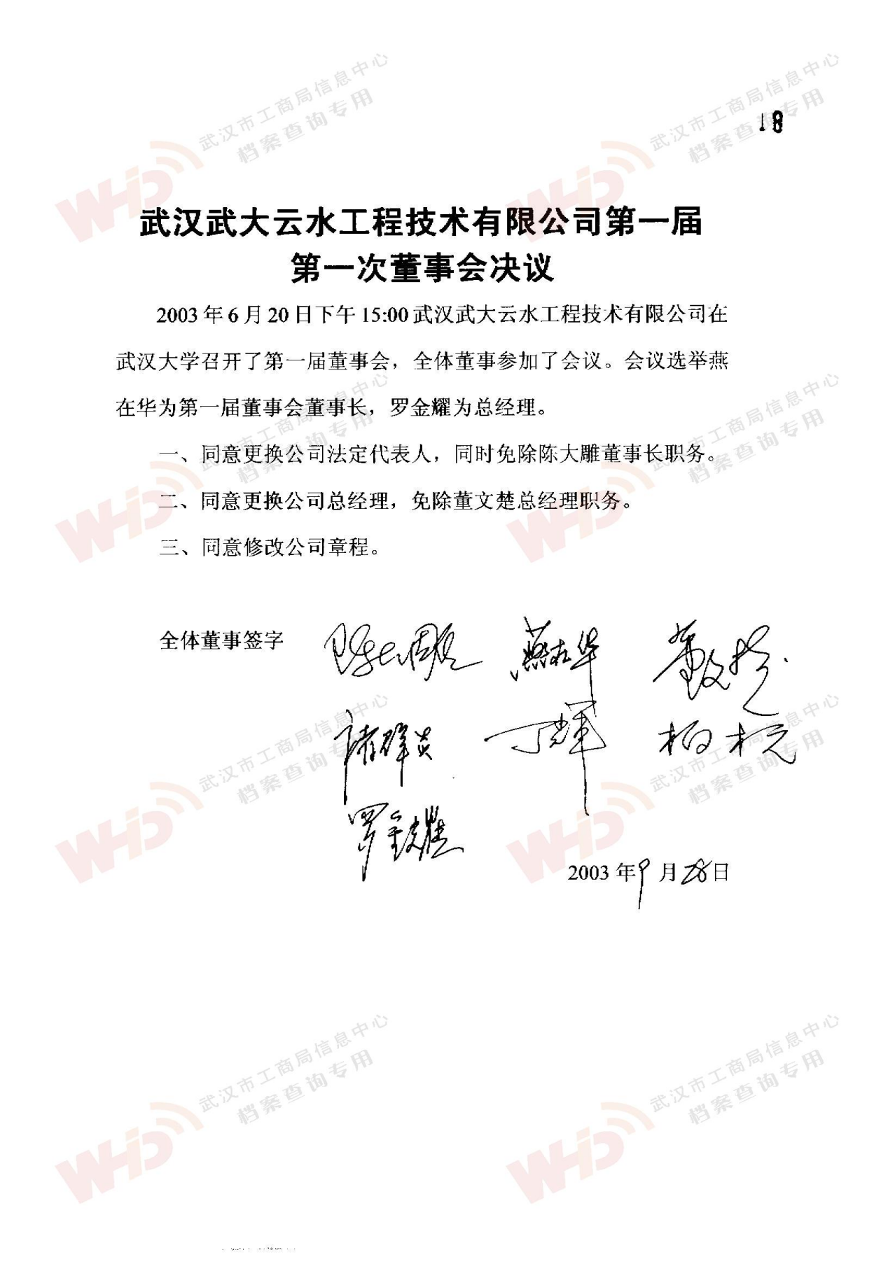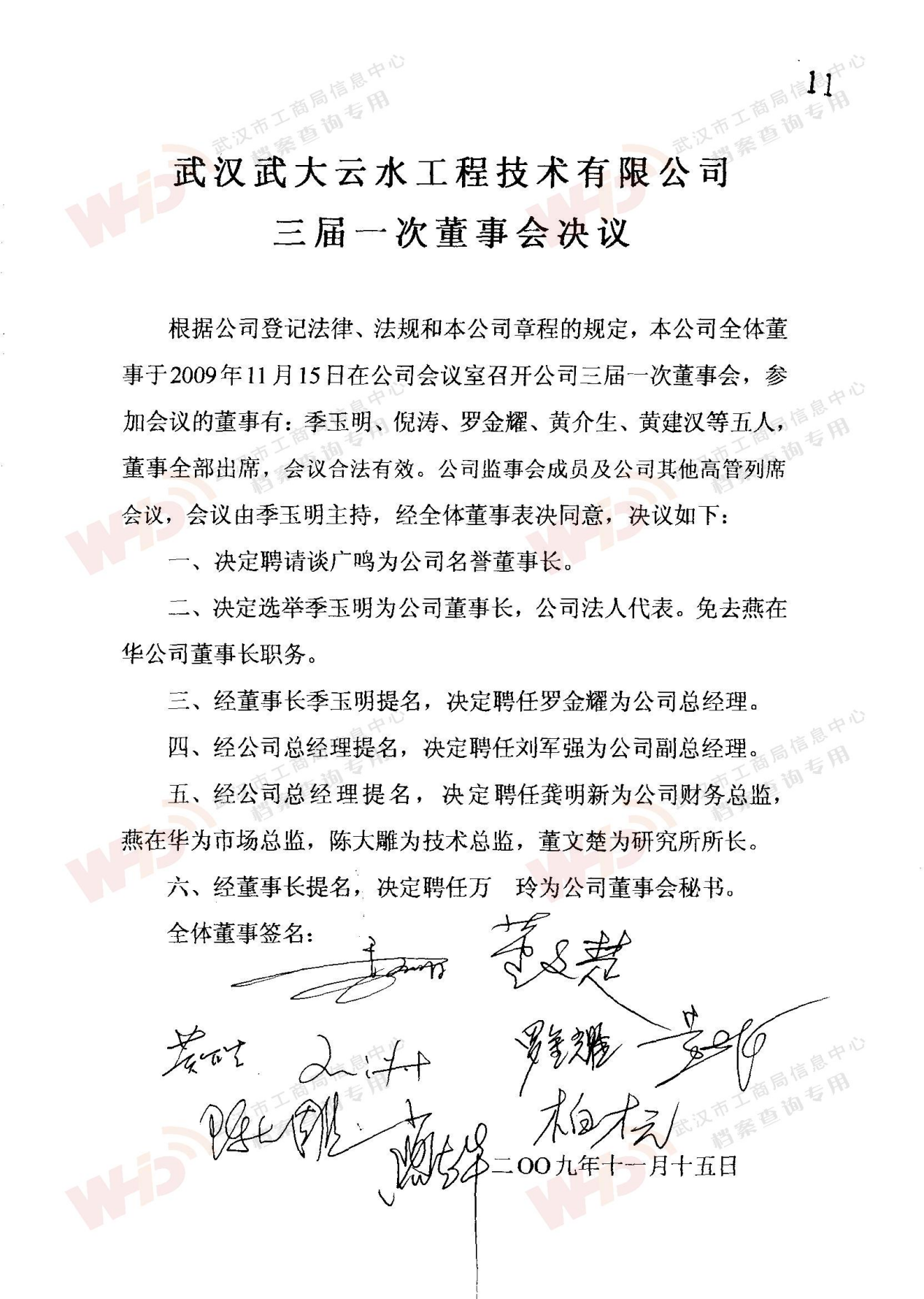 - 2009年11月15日武漢武大云水工程技術有限公司三屆一次董事會決議: 一、決定聘請談廣鳴為公司名譽董事長。 二、決定選舉季玉明為公司董事長,公司法人代表。免去燕在華公司董事長職務。 三、經董事長季玉明提名,決定聘任羅金耀為公司總經理。 四、經公司總經理提名,決定聘任劉軍強為公司副總經理。 五、經公司總經理提名,決定聘任龔明新為公司財務總監(jiān),燕在華為市場總監(jiān),陳大雕為技術總監(jiān),董文楚為研究所所長。 經董事長提名,決定聘任萬玲為董事會秘書。