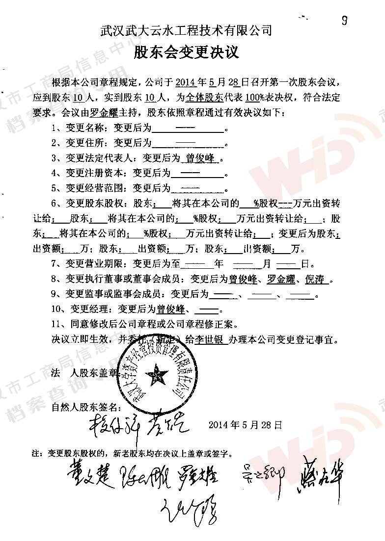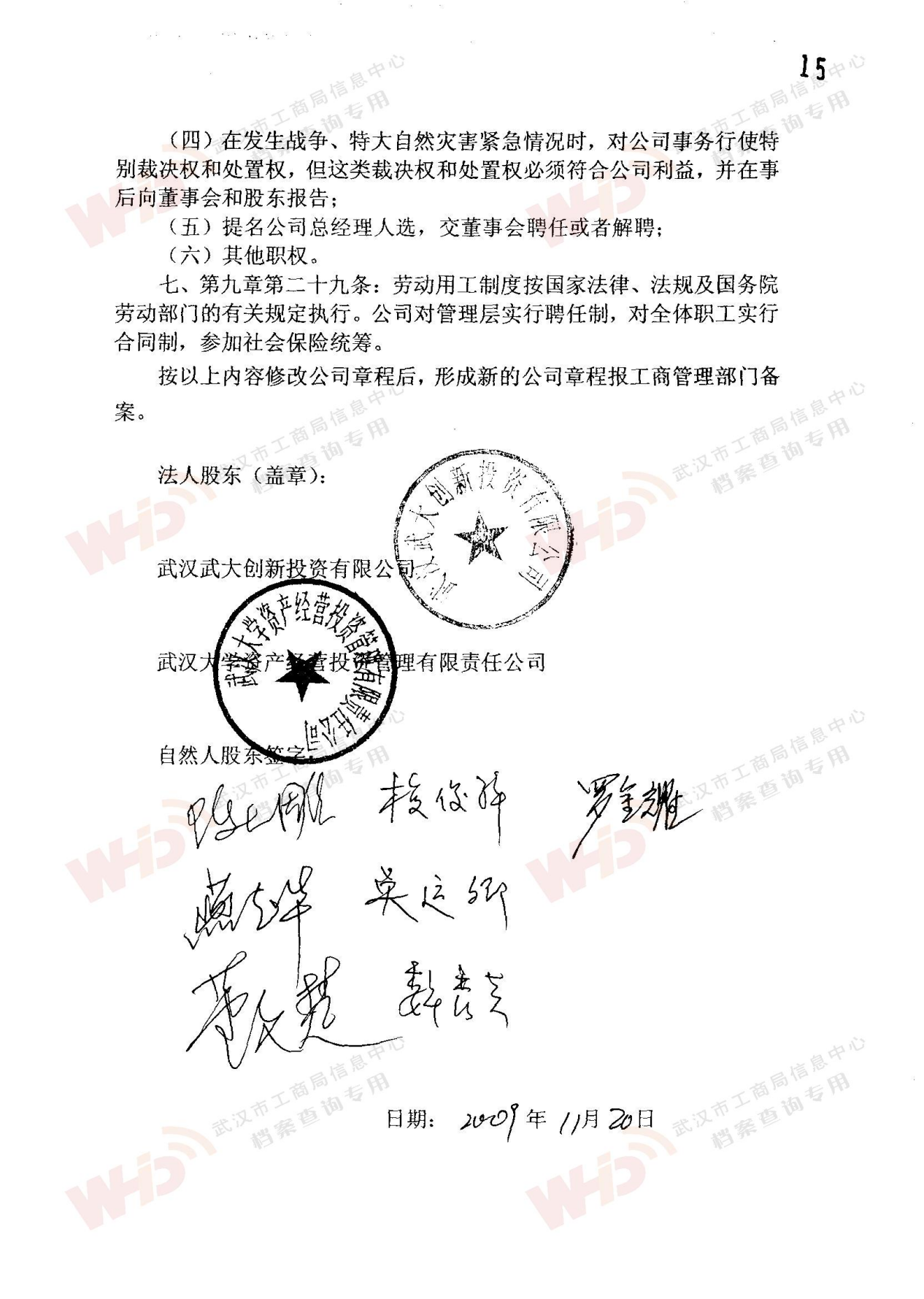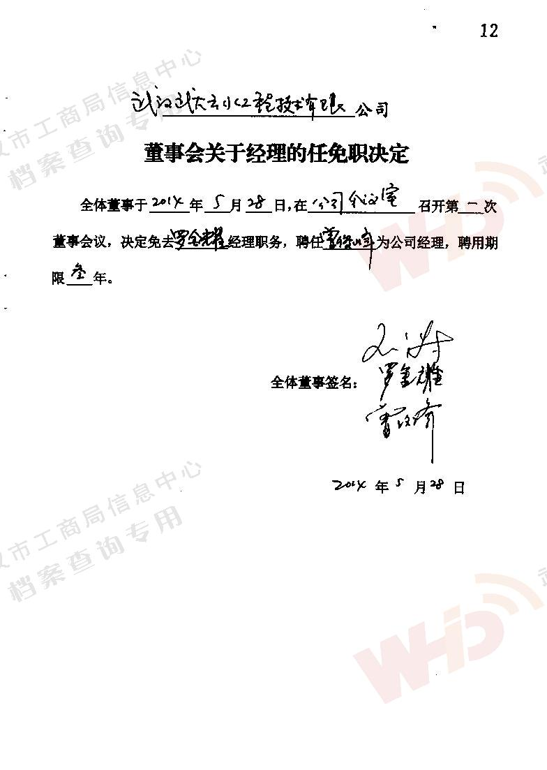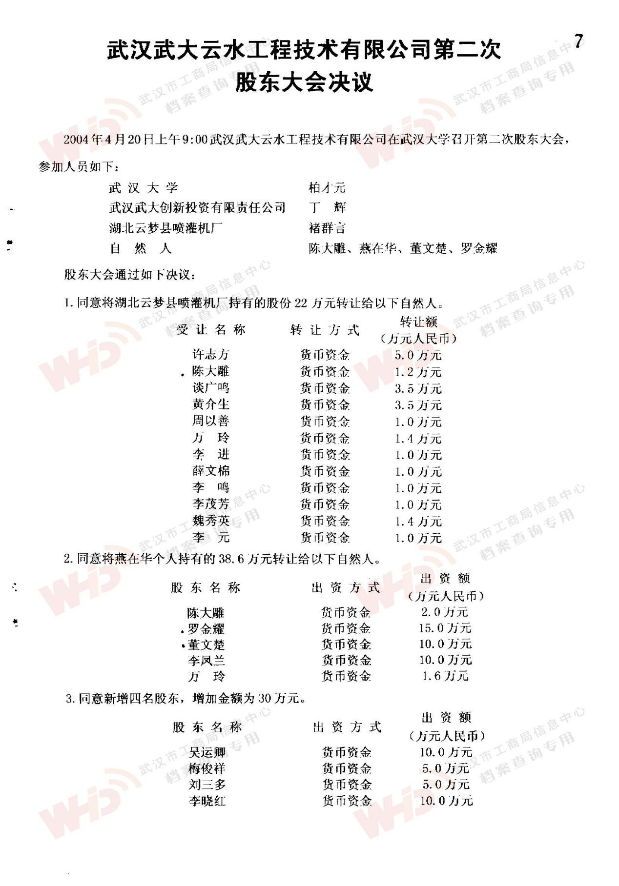 - 2009年11月15日武漢武大云水工程技術有限公司三屆一次董事會決議: 一、決定聘請談廣鳴為公司名譽董事長。 二、決定選舉季玉明為公司董事長,公司法人代表。免去燕在華公司董事長職務。 三、經董事長季玉明提名,決定聘任羅金耀為公司總經理。 四、經公司總經理提名,決定聘任劉軍強為公司副總經理。 五、經公司總經理提名,決定聘任龔明新為公司財務總監(jiān),燕在華為市場總監(jiān),陳大雕為技術總監(jiān),董文楚為研究所所長。 經董事長提名,決定聘任萬玲為董事會秘書。