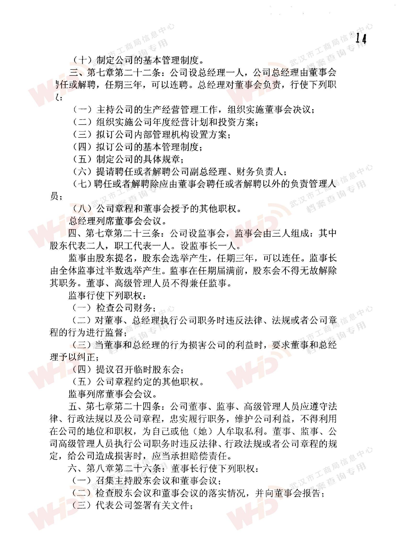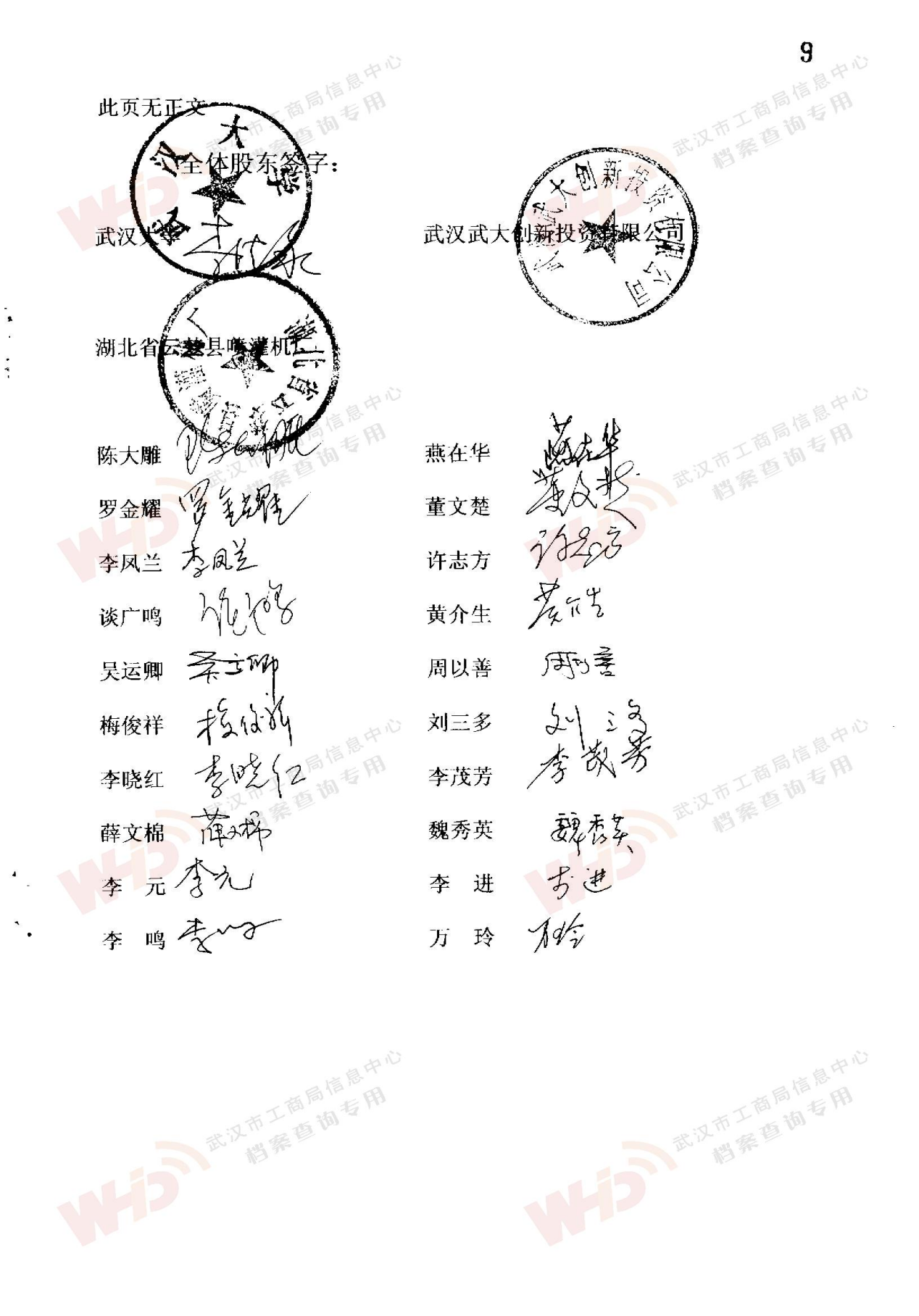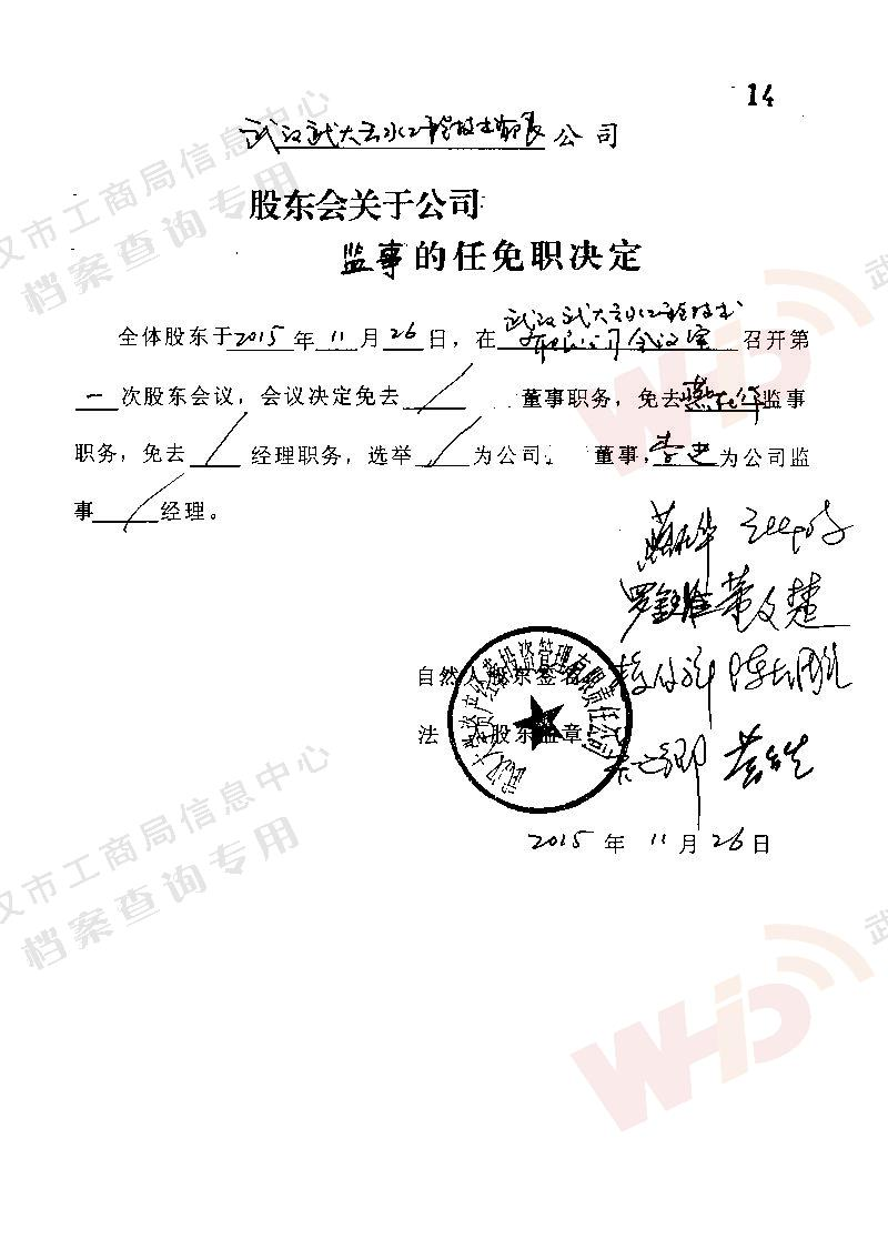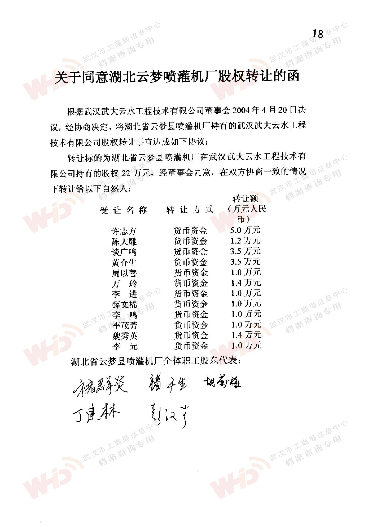 - 2009年11月15日武漢武大云水工程技術有限公司三屆一次董事會決議: 一、決定聘請談廣鳴為公司名譽董事長。 二、決定選舉季玉明為公司董事長,公司法人代表。免去燕在華公司董事長職務。 三、經董事長季玉明提名,決定聘任羅金耀為公司總經理。 四、經公司總經理提名,決定聘任劉軍強為公司副總經理。 五、經公司總經理提名,決定聘任龔明新為公司財務總監(jiān),燕在華為市場總監(jiān),陳大雕為技術總監(jiān),董文楚為研究所所長。 經董事長提名,決定聘任萬玲為董事會秘書。