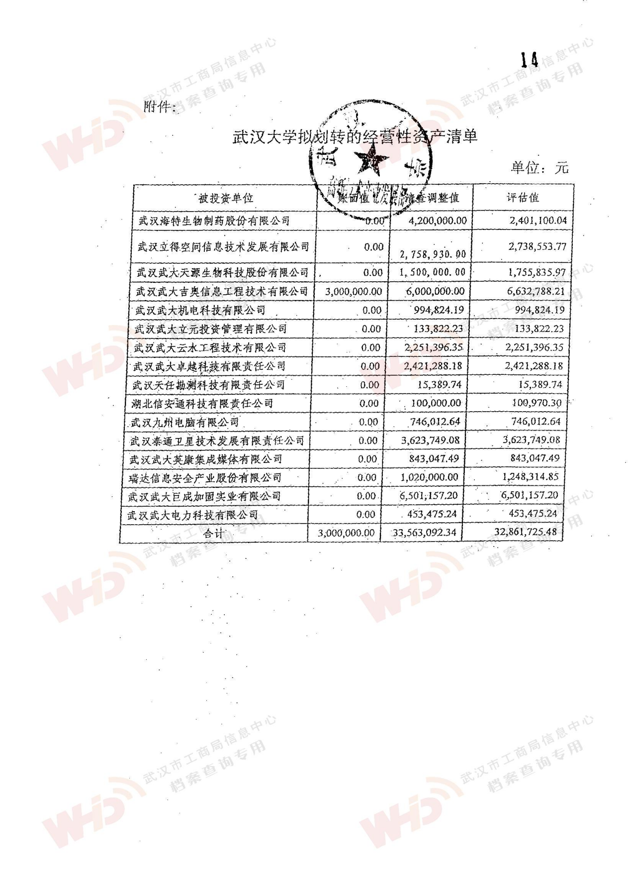 - 2008年8月8日武漢大學同意將所持武大云水股份劃轉給武漢大學資產經營投資管理有限責任公司。