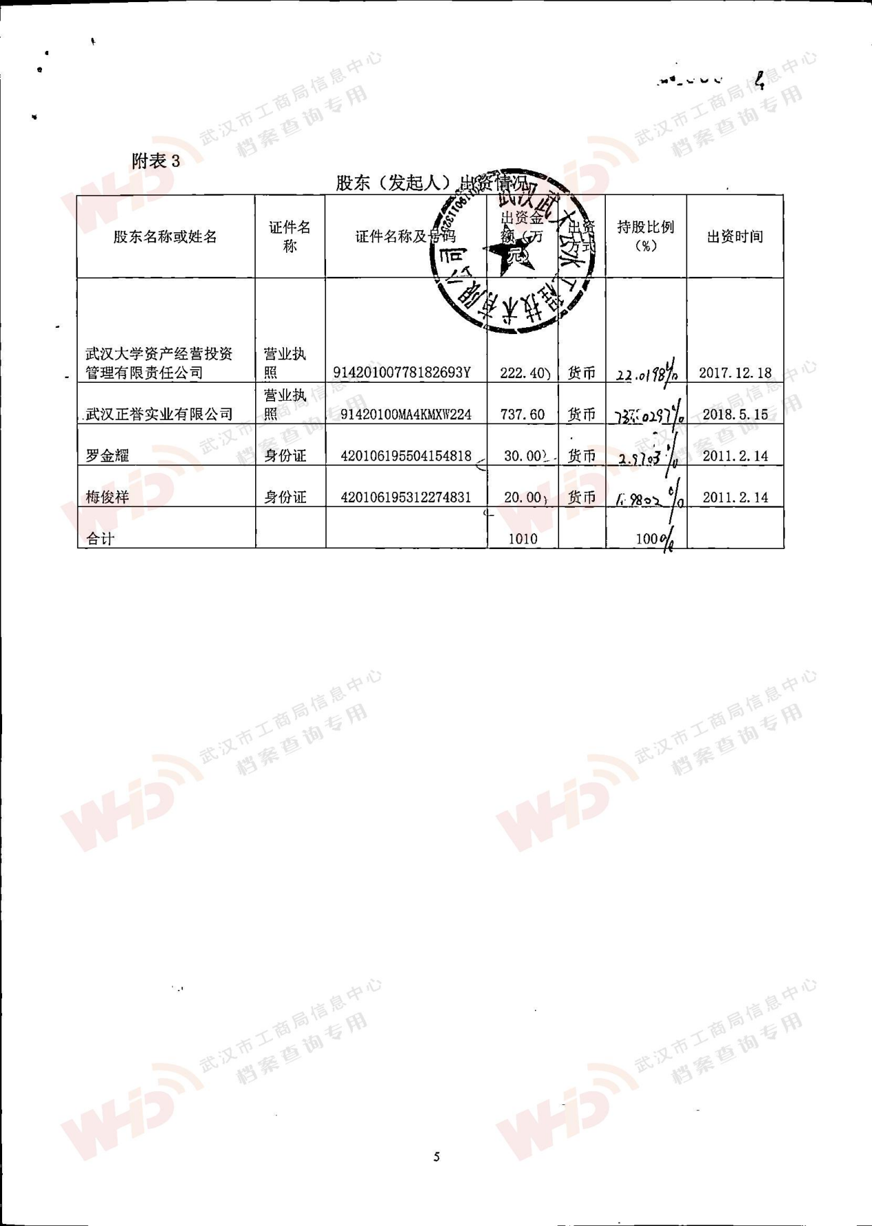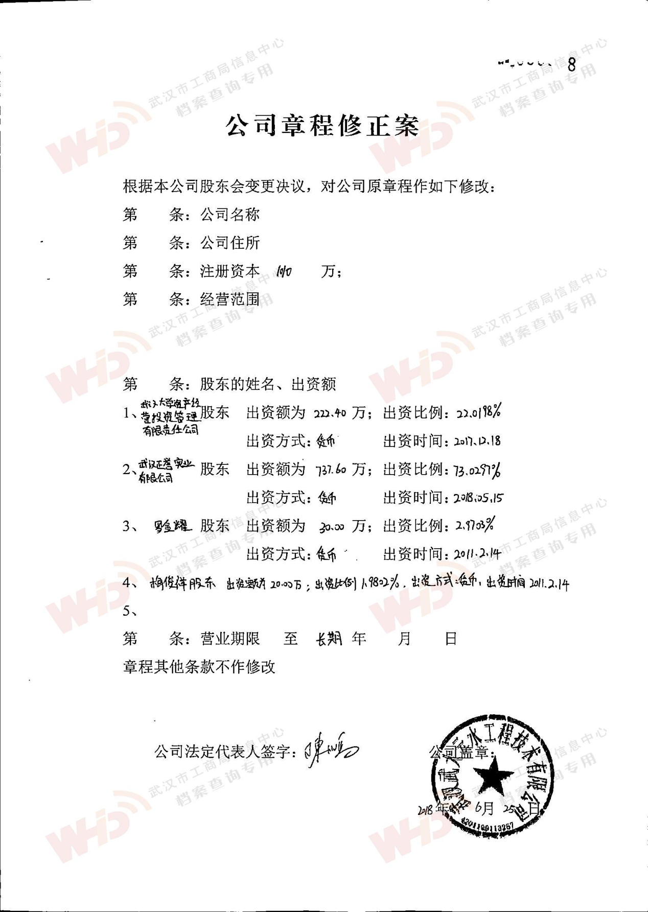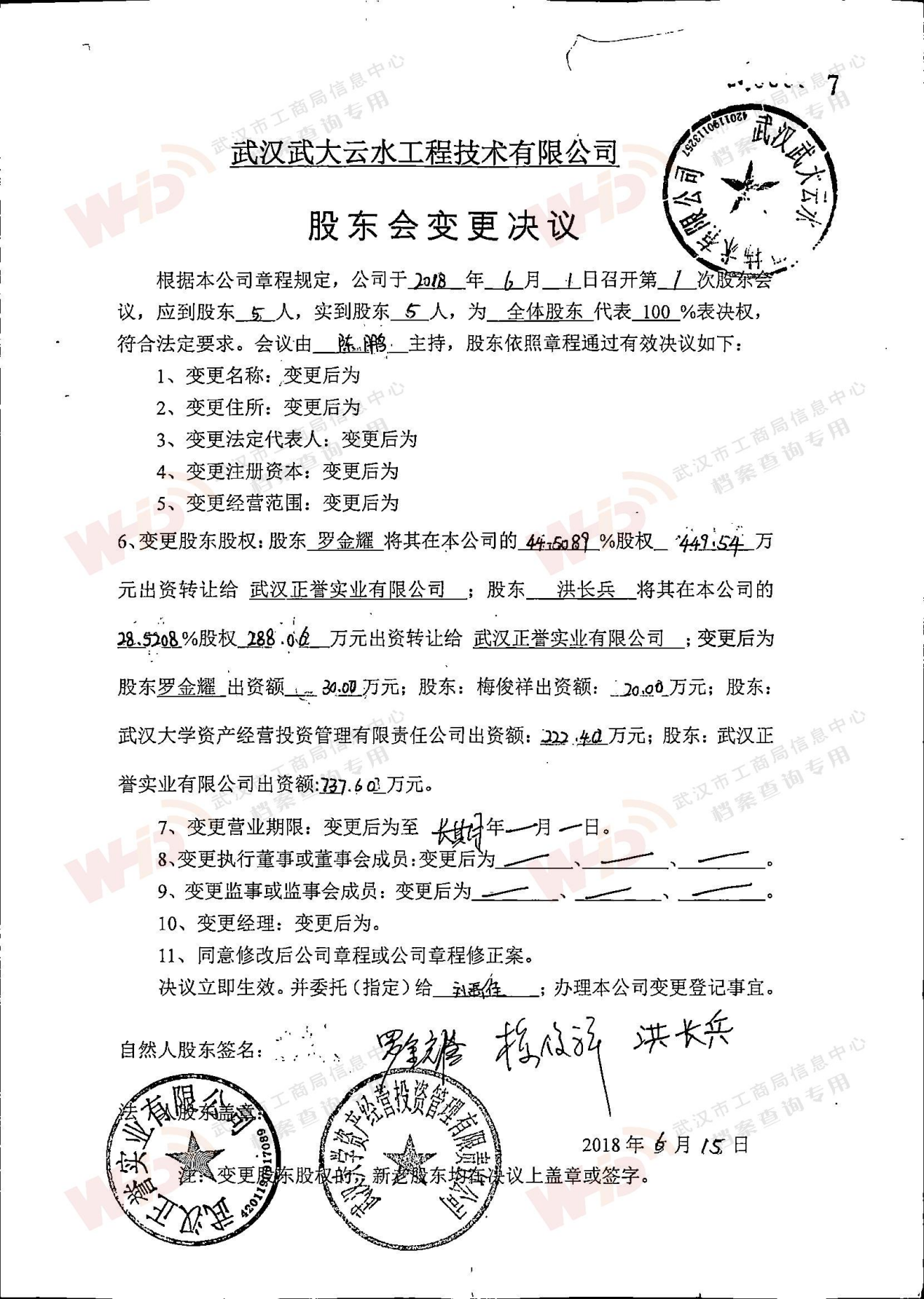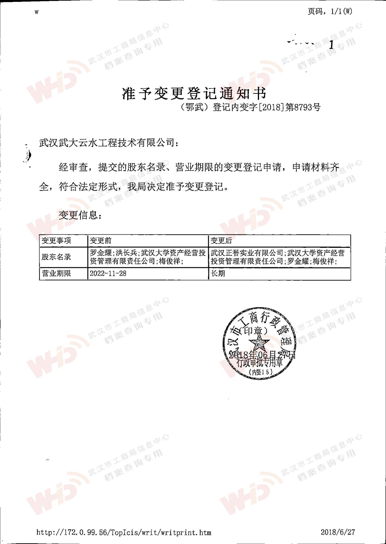 - 2018年5月15日武漢正譽實業(yè)集團有限公司入股武漢武大云水工程技術有限公司。